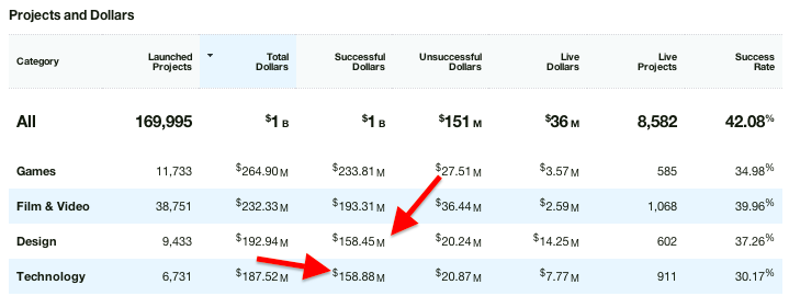 The hardware, technology, and design categories on Kickstarter have a track record of over-funded campaigns. Just because you might set a $50,000 goal doesn’t mean that you will raise $50,000.