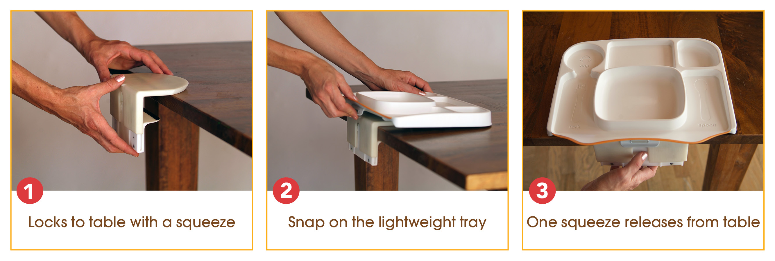 Lock-on Table Tray set offers a variety of vivid colors, a unique soft spill-catch lip, and no-throw bowls built directly into the tray. It also features interactive locations for plates, bowls, sippy cups, spoons and forks so a baby can learn to put things back in place. Lock-On Table Tray sleek design is travel friendly and designed for at home and restaurant use. It attaches to tables in seconds, so that babies can’t toss it, spill it or throw it! Made out of BPA and phthalate free material, the tray is dishwasher safe and easy to clean. Providing convenience for parents, it also helps to establish a deeper connection with a child early on.