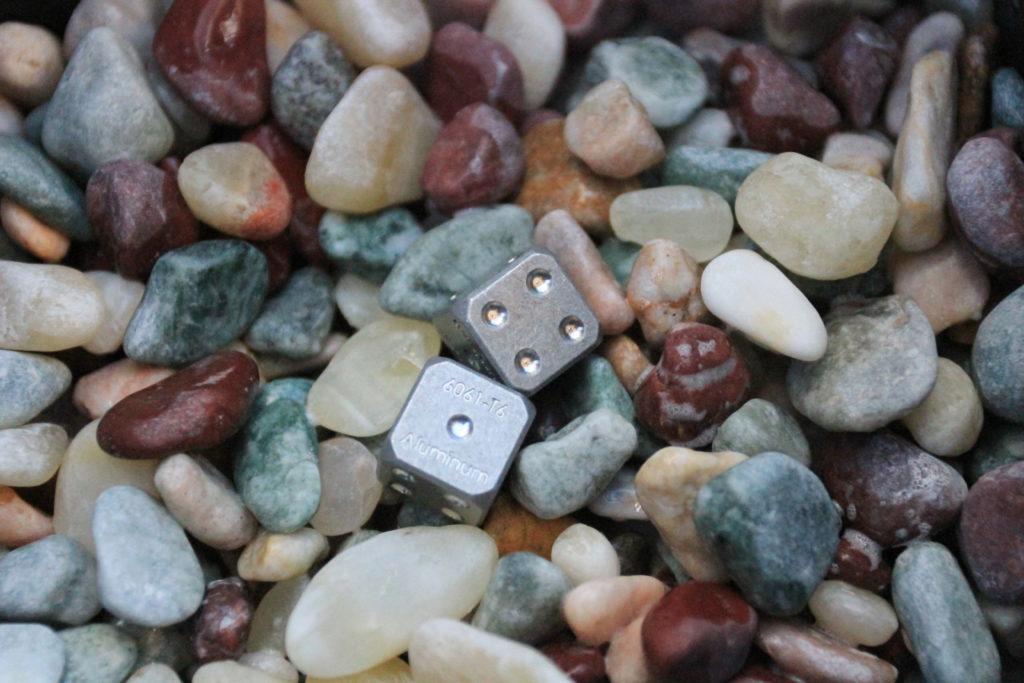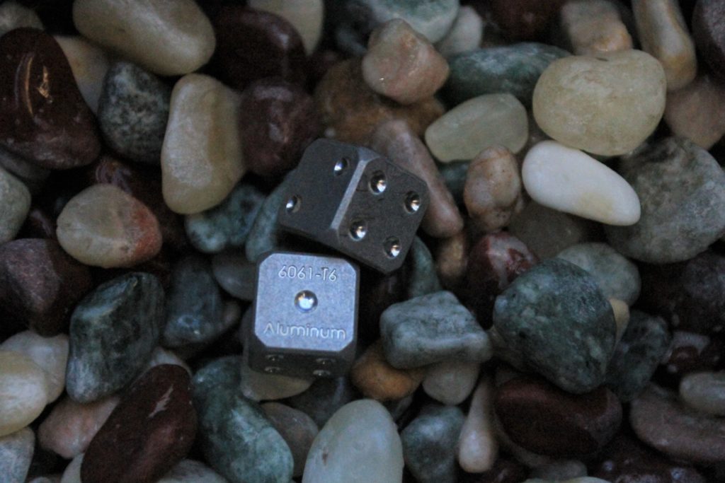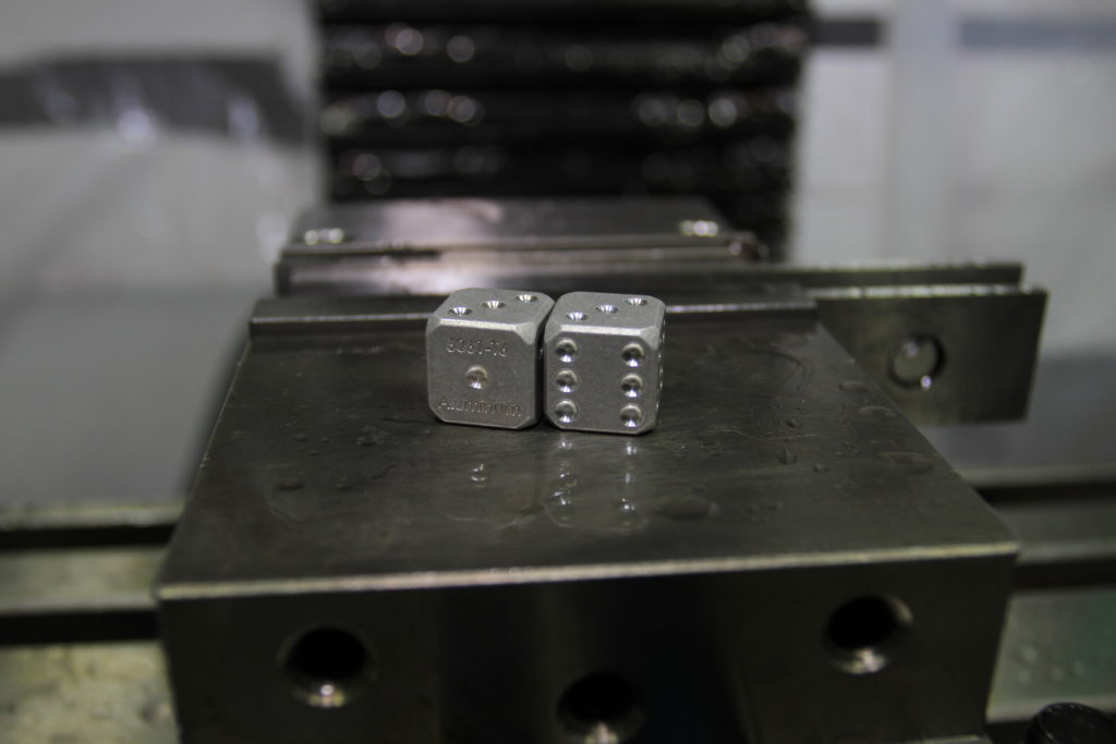 Grant is currently raising funds with about 2 weeks to go to bring his CNC machined stone washed dices to the masses. From the space in his family garage he has his Tormach PCNC1100M machining the face of six dice at a time. There are options to have them engraved with the alloy that they are made of such as “6061-T6 Aluminum” or without the engraving. Each dice is then stone washed for a nice weathered matte look with high contrasting polished pids making each side easy to read.