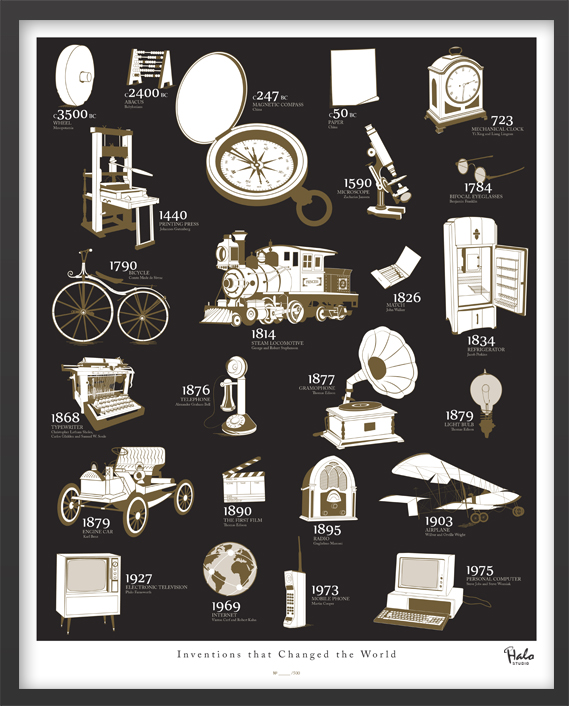 The design include 24 inventions that changed the world, from c3’500BC to the 20th century, hand-illustrated with details. Next to each invention, appears the year it was invented and the name of the inventor (unless the details are not known).