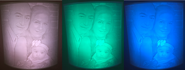 The significance of photo 3D printing is that it opens new avenues for personalized gifts for various occasions like Christmas, birthday, anniversary to name a few. 3D printed photos can be placed on a window and the picture characteristics can change by sun light. A color changing LED light even gives more stunning effect to a 3D printed photo as shown in picture below. Also, a lamp shade can be found in most of homes and its shade can be converted to a 3D printed photo making it more interesting! Photo 3D printing provides unprecedented choices for personalization around home and it’s time to take advantage of it.
